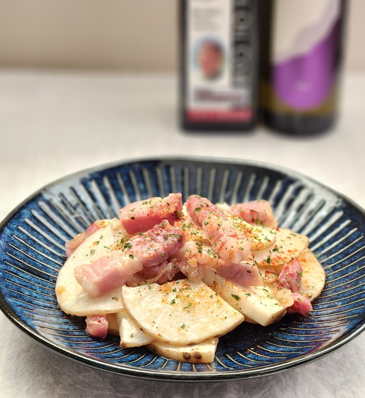 ガーリック風味と唐辛子風味の2種類のオリーブオイルを使い、ベーコンとニンニクを香ばしく炒め、薄切りの長いもをさっと焼き上げました。